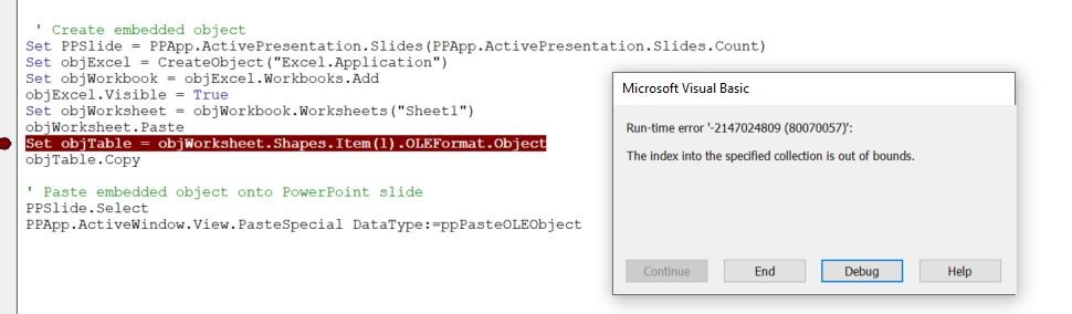 ' Create embedded object Set PPSlide = PPApp.ActivePresentation.Slides(PPApp.ActivePresentation.Slides.Count) Set objExcel = CreateObject("Excel.Application") Set objWorkbook = objExcel.Workbooks.Add objExcel.Visible = True Set objWorksheet = objWorkbook.Worksheets("Sheet1") objWorksheet.Paste Set objTable = objWorksheet.Shapes.Item(1). OLEFormat.Object objTable.Copy