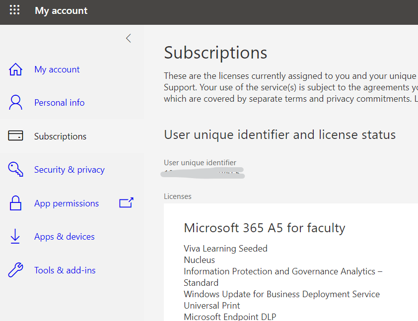 - Please also share your subscription info with us by sign your work or school account in View account > Subscriptions to take a screenshot as shown below: