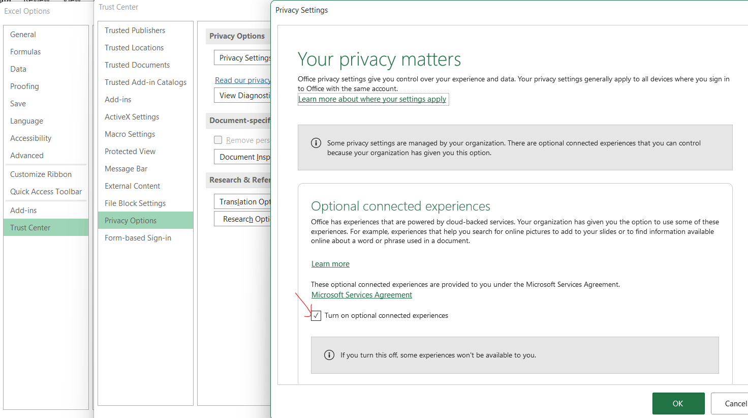 - In Excel, select File > Options > Trust Center > Trust Center Settings.