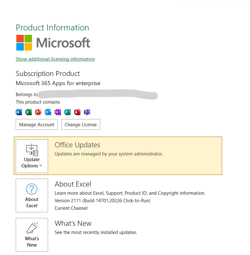 - If you are using Office desktop app, please share your Office version with us by taking a screenshot from Excel > File > Account as shown below: