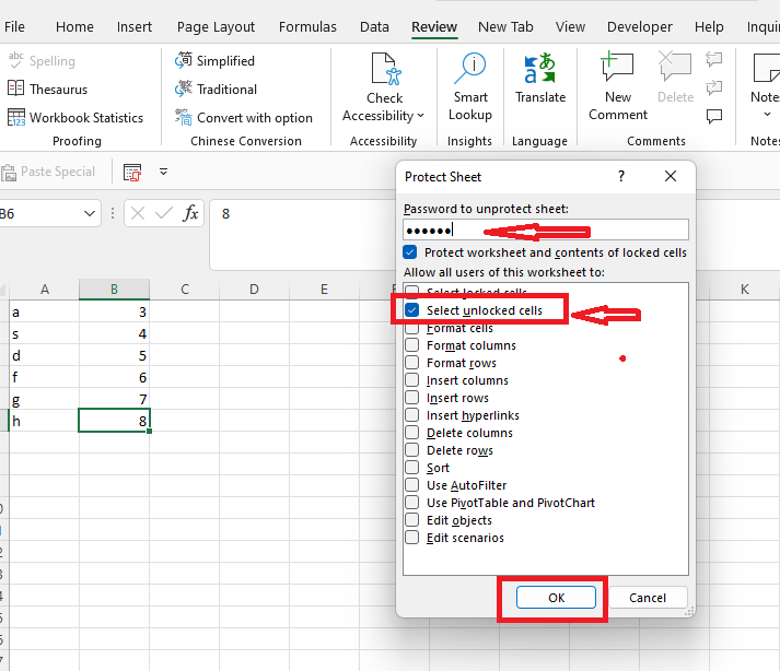 2.Click on Review tab>protect sheet>under protect sheet dialog box only check/tick the "Selected unlocked cells" option and user password to protect the Excel sheet.