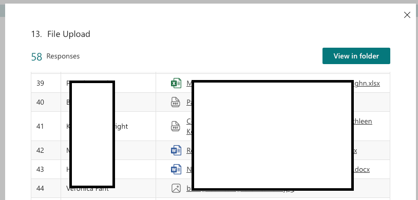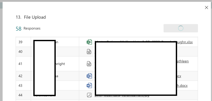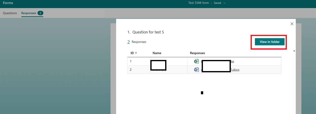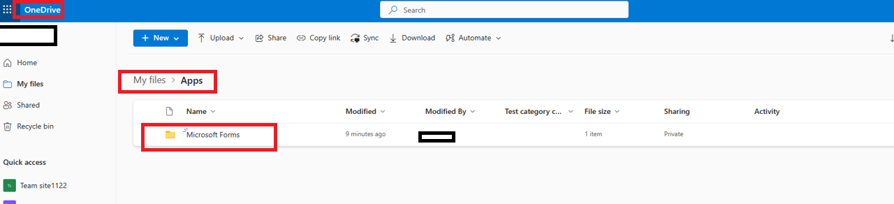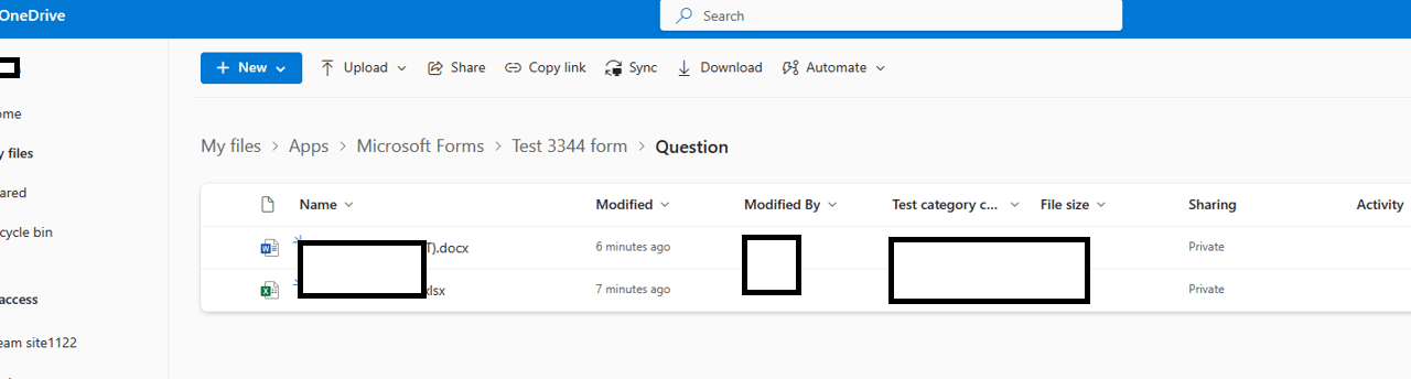 If possible, could you please try to directly go to files upload folder from OneDrive location via click on OneDrive>My files>Apps>select Microsoft Form and check you are to view in this way.