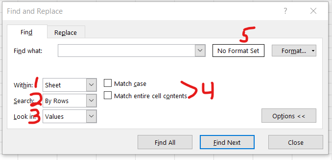 - That the format option says No Format Set. If it says anything else, use the Format dropdown to the right and click on "Clear Find Format".