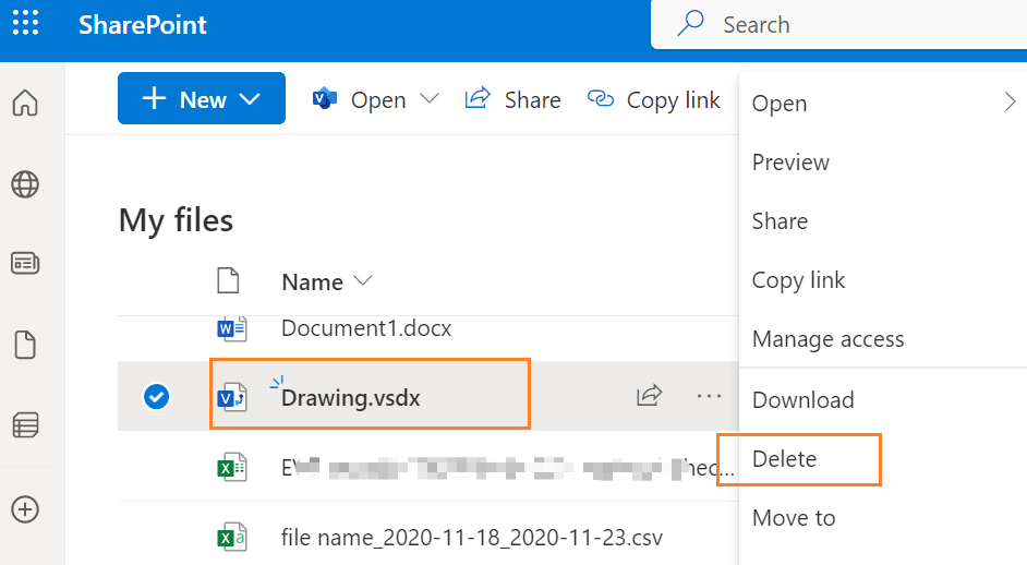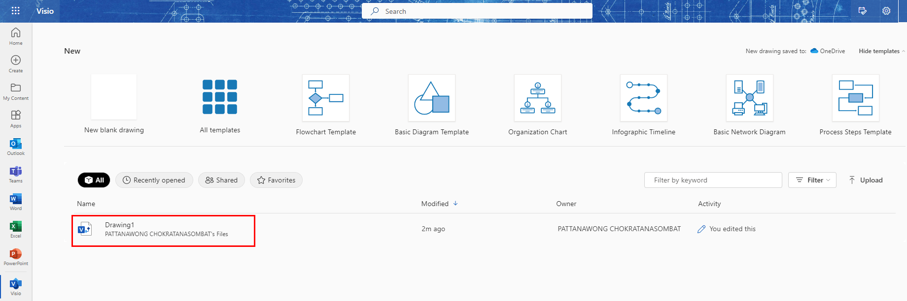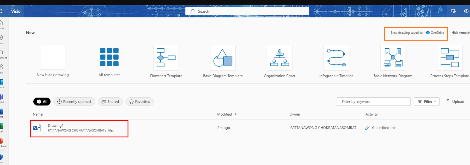 As you can see on the upper right corner, Visio file will be saved to your OneDrive. Therefore, if you want to delete it, you need to find this file in OneDrive and delete it as below.
