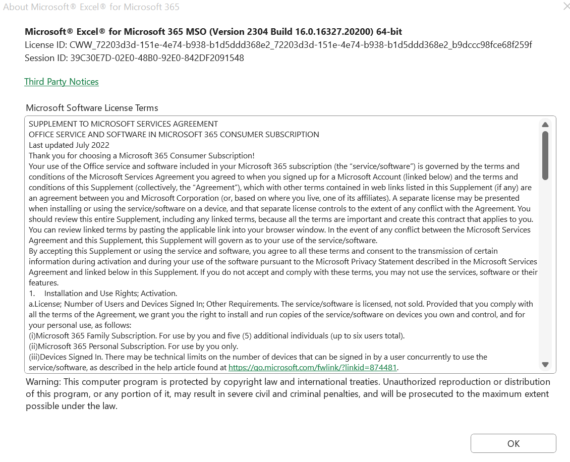 Microsoft® Excel® for Microsoft 365 MSO (Version 2304 Build 16.0.16327.20200) 64-bit