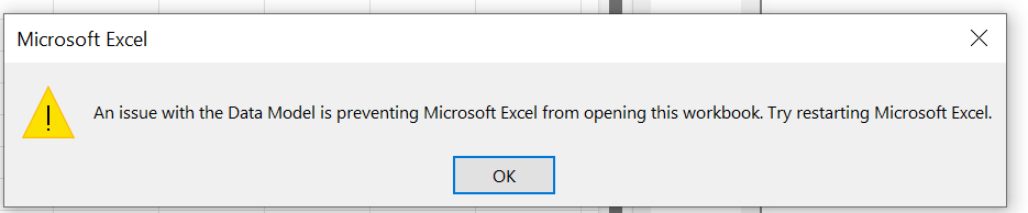 "An issue with the Data Model is preventing Microsoft Excel from opening this Workbook. Try restarting Microsoft Excel."