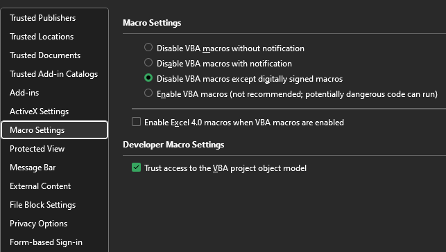 When I checked the info section of the file, Excel detects the file to have came from internet and does not identify the drive as full file path and location is just shown as drive letter e.g. U:>Folder name> instead of \server-name\Folder name