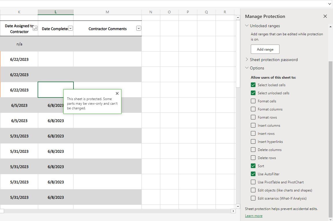 | Adding or changing data validation | Merging cells or splitting merged cells |