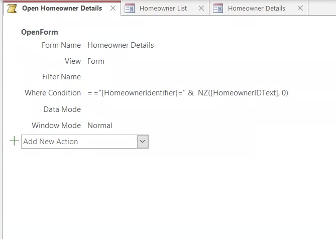 The OpenForm method is then called with that expression as its WhereCondition argument. The ClientID is also referenced as the OpenArgs argument, which passes its value to the other form.