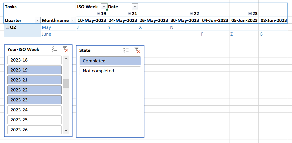 I've used the "Year-ISO Week" field for the slicers, because 2023 has KW52 twice! one is from the last week in 2022 and the other is at the end of 2023.