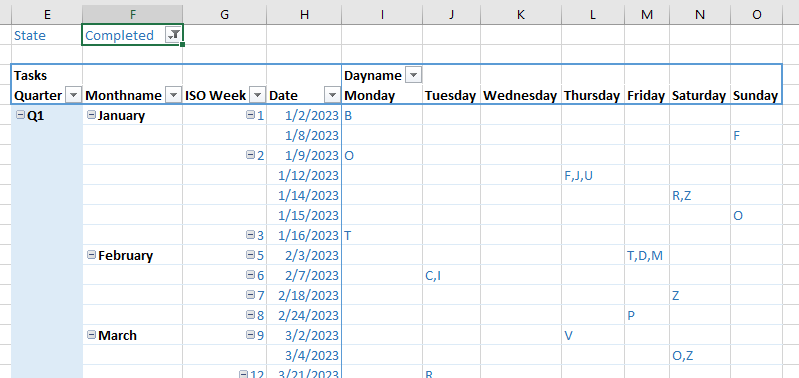 Again: You can drag&drop any field from my calendar into the row or column section as you like, it works as you expect.