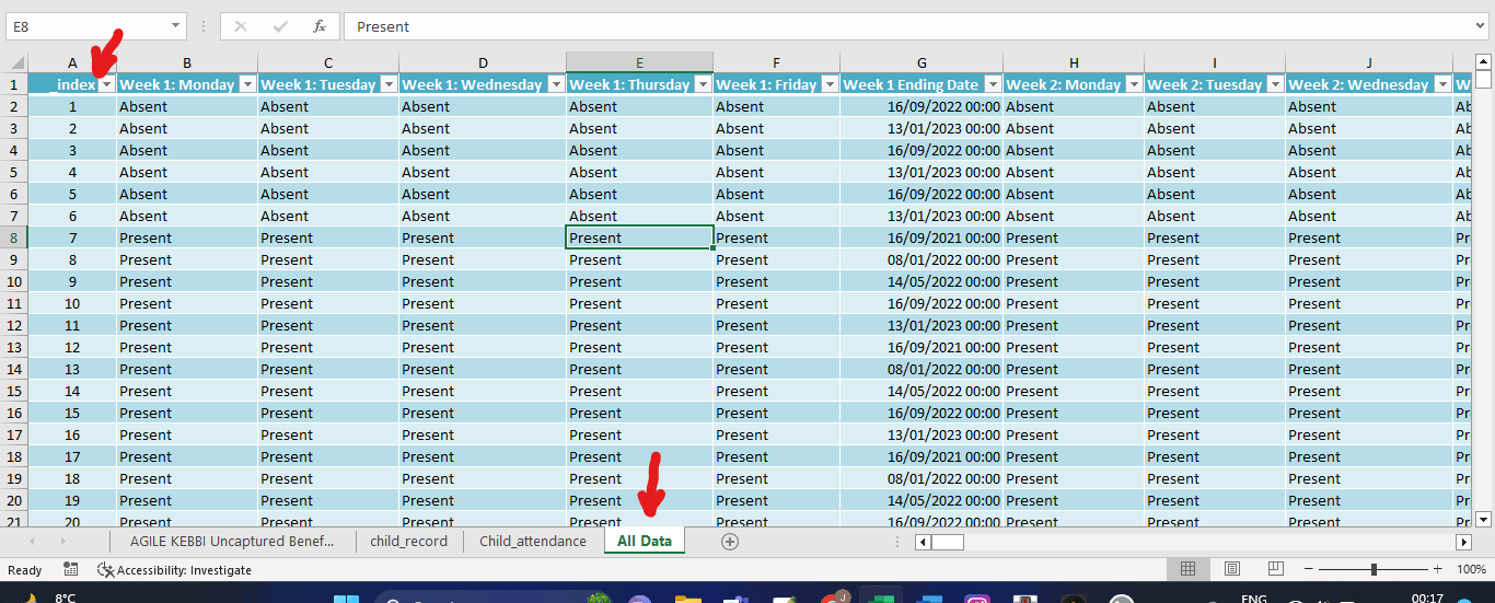 Therefore we should have the attendance have the same number of rows so it can be merged with the Child_record sheet and give us a final sheet with the students and their attendance.