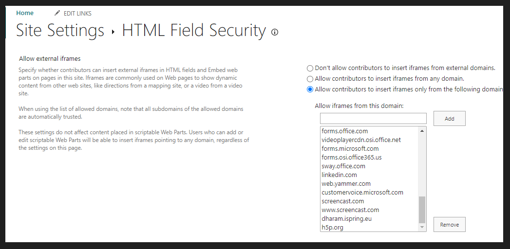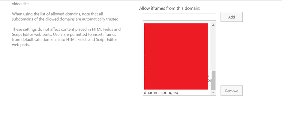 As you have added the both domains successfully, please try to remove added Embed webpart in the page> Refresh the page> Edit the page> Add the Embed webpart> Add the code (Note: Please remove htmlCopy Code from your iFrame which place at the start)> After adding the code, please hover your mouse outside the embed code box and click anywhere.