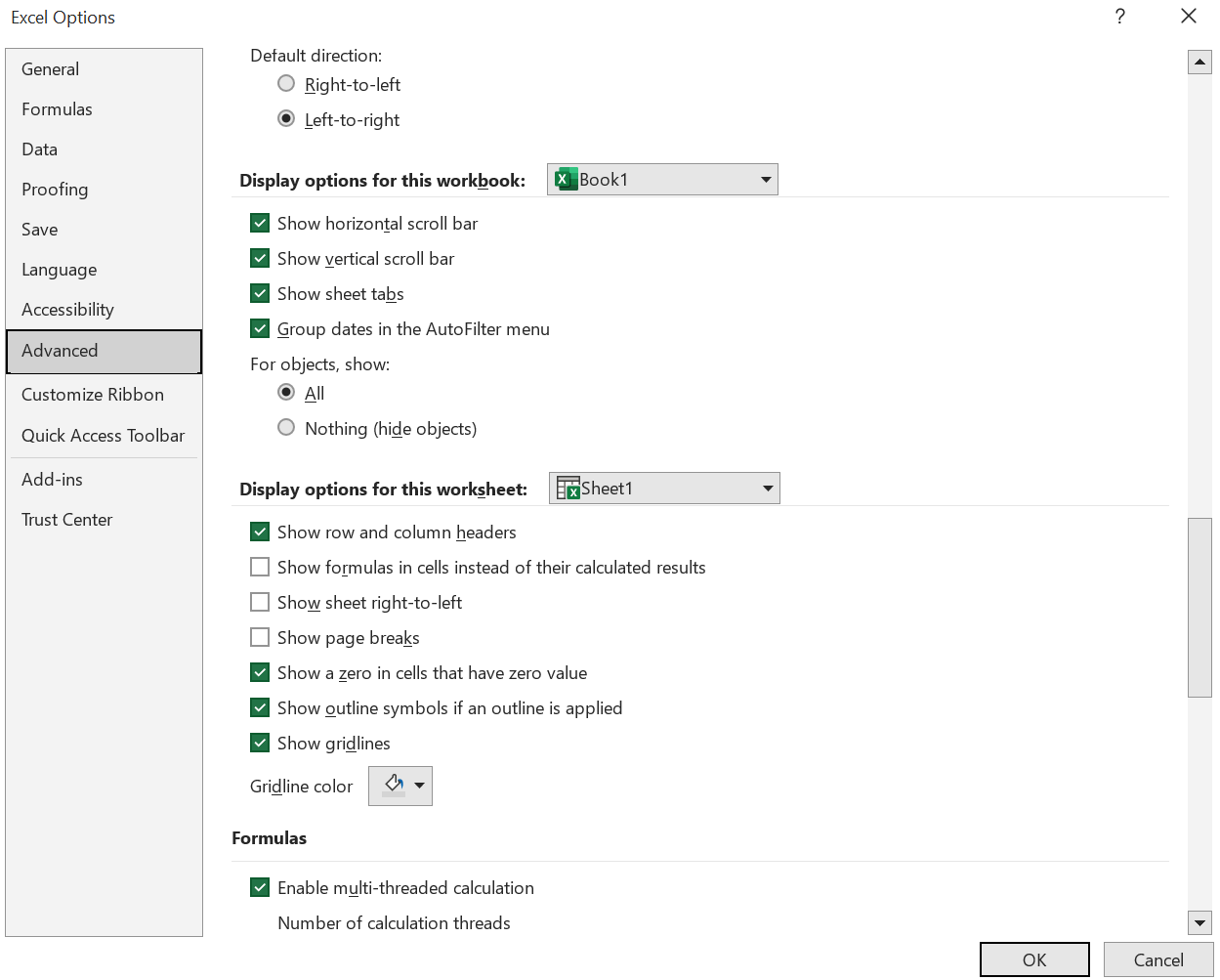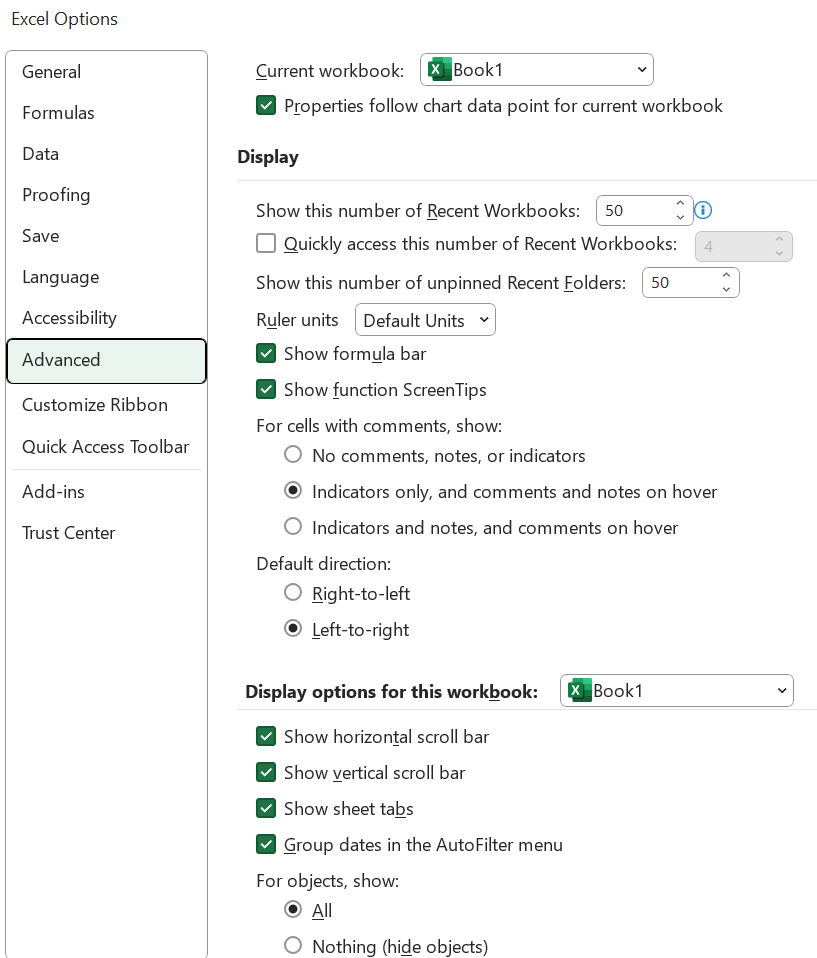 - In the Excel Options window, click on "Advanced" in the left-hand menu.