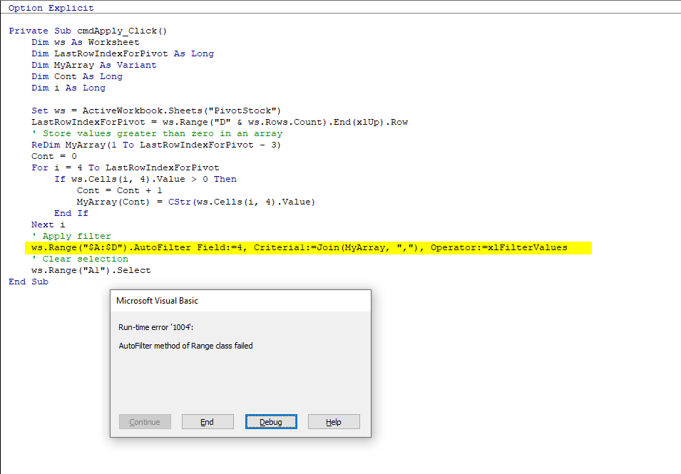| Then, replace this line:<br><br><br><br><br> ActiveWorkbook.Sheets("PivotStock").Range("$A:$D").AutoFilter Field:=4, Criteria1:=MyArray, Operator:=xlFilterValues <br><br><br><br><br>with this line:<br><br><br><br><br> ActiveWorkbook.Sheets("PivotStock").Range("$A:$D").AutoFilter Field:=4, Criteria1:=Array(MyArray), Operator:=xlFilterValues |