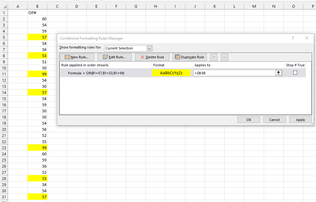 Note that the formula is created for the first cell of the "Applies to" range which is B1 when it is the entire column and Excel applies it to the remaining cells of the range. If you specify a specific range like B2:B31 then B2 is the first cell of the range so substitute B2 for B1 because the first cell of the "Applies to" Range is B2.