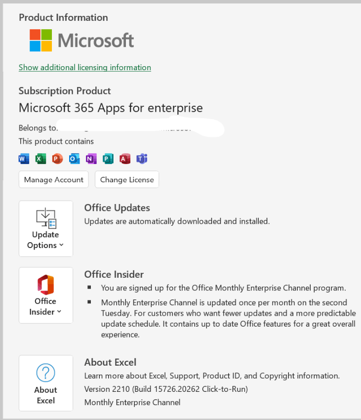 3.To narrow down the issue, may I know the version of your Excel? Please go to File>Account, capture a screenshot of Product Information, as shown below.