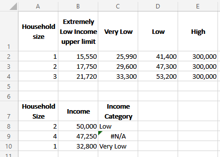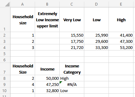 Hello! thanks for the quick reply, but it looks like the result is wrong for the first example (C8). If the household size is 2 and the income is 50,000, the household would be considered a high income category, not low. The numbers provided in the table are the upper limit that place someone in that category. Do you know how to fix that? The third example (C10) is correct though. Do I just need to change the ranges to the minimum value instead of the maximum income value?