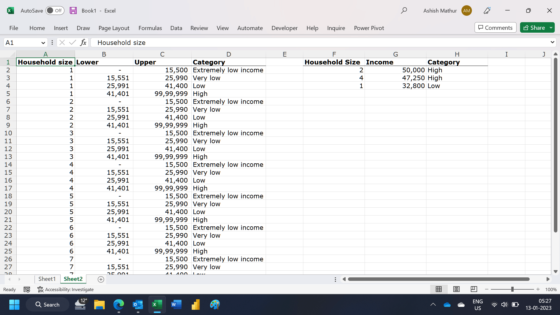 I need help with finding the right formula for Excel to put data into categories. The category that it needs to be in depends on two factors: household size and income. First, I need it to understand how many people are in the household (a number between 1 and 8, so an exact match), then within that category, I need it to return the income category (extremely low, very low, low or high) based on income ranges (so not an exact match, which is what I am having difficulty with). I have figured out how to reference two requirements if they are BOTH an exact match, but the income ranges will not be an exact match. I need it to reference income limits. I have made multiple tables in hopes the table structure was the problem. I have also tried putting all the income limits in ascending order but that also has not worked. I have tried using VLOOKUP, INDEX, and MATCH but none of them work for my specific case. For some reason my screenshots are not uploading no matter what I try, so I hope this can be solved without screenshots. I made a table below for some reference: