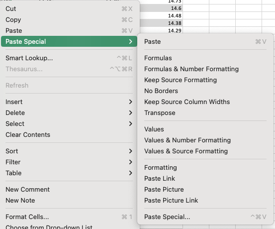 Right-click on the destination cell and choose “Paste Special” from the context menu.