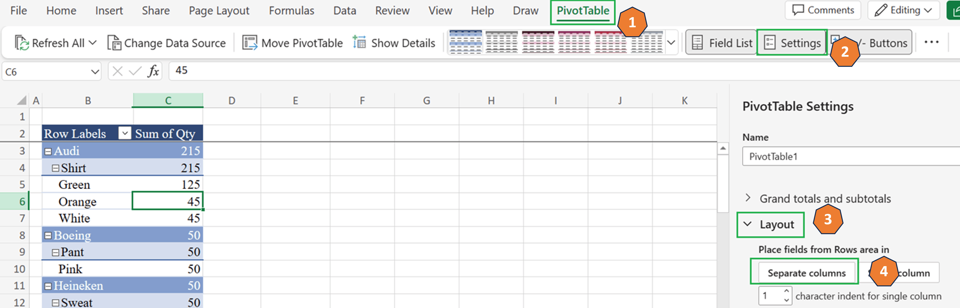 After creating the pivot table from the data set, I am having trouble changing the report layout to tabular. I have searched for the "design" tab in order to do this, but I cannot find it.