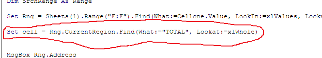 Set cell = Rng.CurrentRegion.Find(What:="TOTAL", Lookat:=xlWhole)