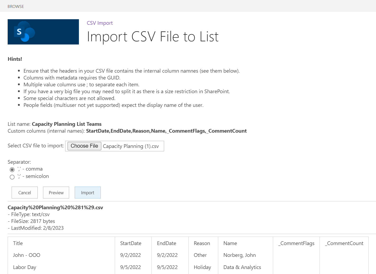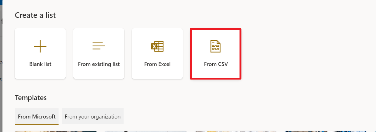 However, when I tested the above "From CSV" option on my side, I will be stuck on the blank page of the file upload. And I also tested on the different tenants and different devices, the same results.