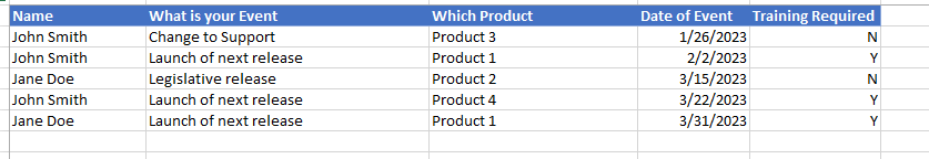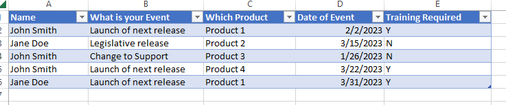 Here is the first tab called Future Events, the data is a copy and paste special (as a link) from the Form 1 tab: