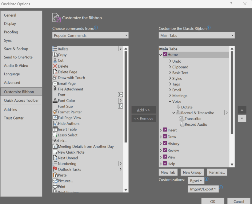As per the description shared, I understand you are not able to see the Transcribe feature in the OneNote application and since the Transcribe feature availability starts from the version 2211 Build 16.0.15819.20000 or later, and since the Transcribe feature is displaying in the customize ribbon but not in the ribbon, I would like to request you to share the OneNote 365 Account page screenshot so we can test the behavior in the same version of the OneNote 365 app and guide you futher.