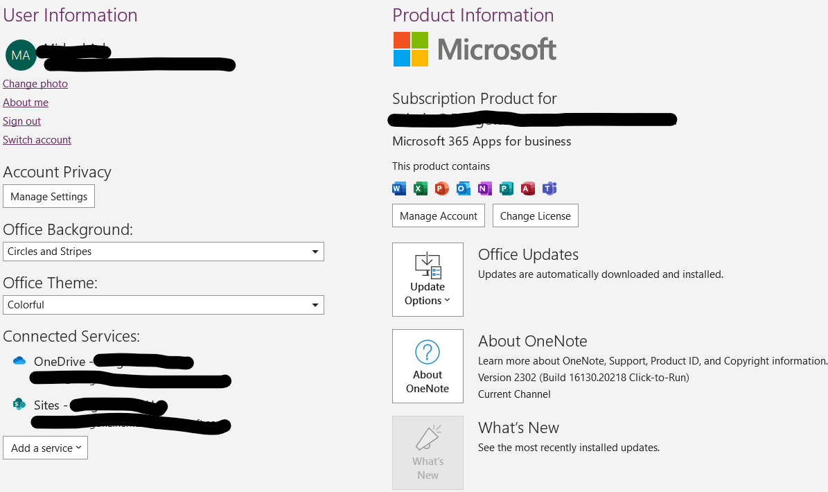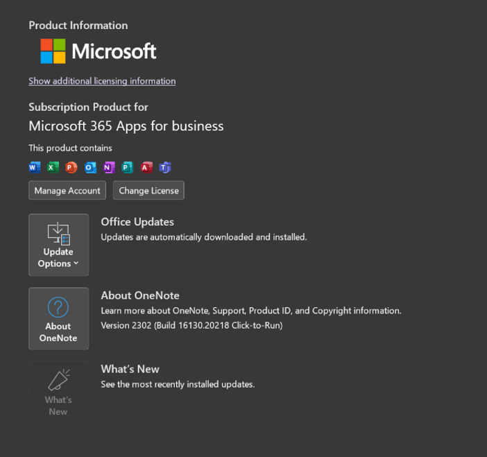 Open the OneNote app> File> Account> Take a screenshot and share it with us.