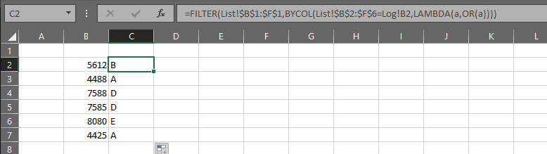 =TOROW(IF(List!$B$2:$F$6=Log!B2,List!$B$1:$F$1,NA()),3,TRUE)