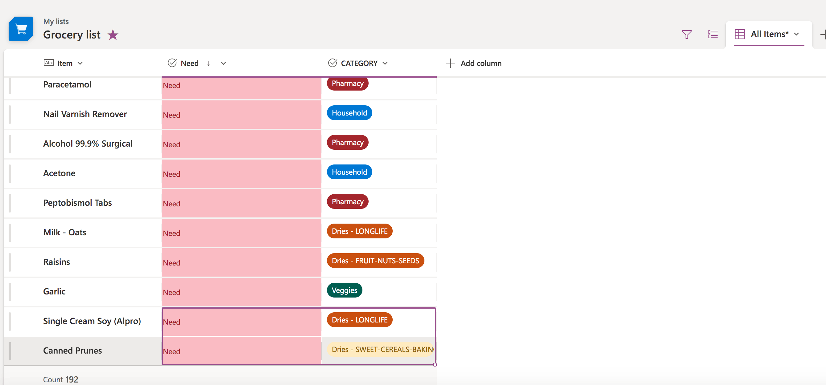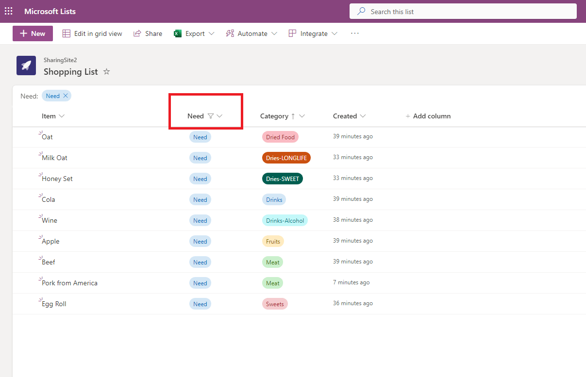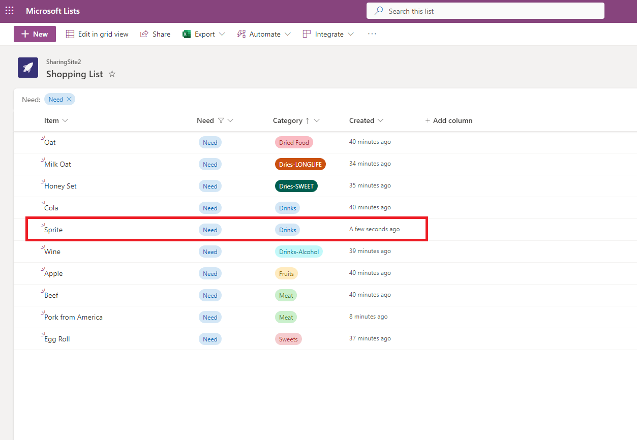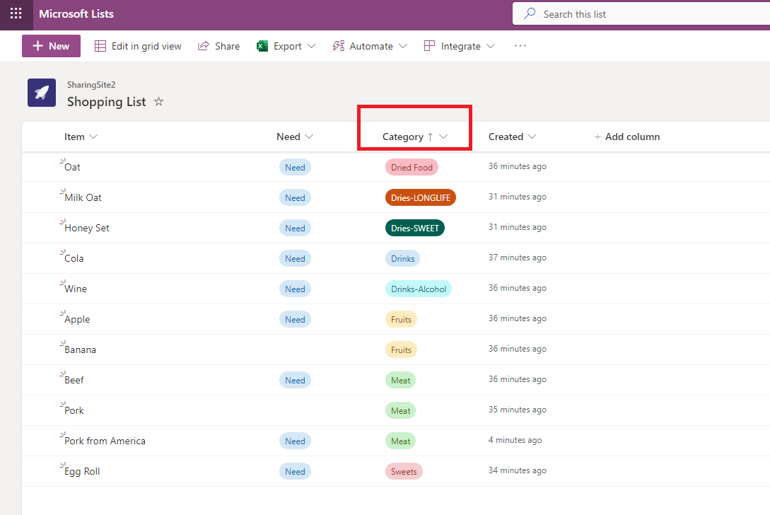 Finally I add the new item Sprite, the Category column is still in the alphabet order.