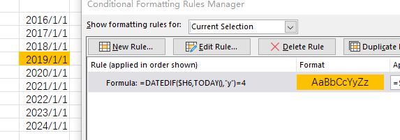 so formula to highlight rows red is year element of date in H6 is greater than 4: