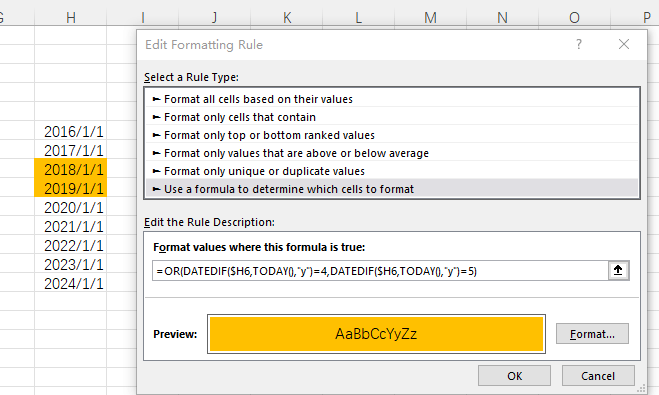 =or(DATEDIF($H6,TODAY(),"y")=4,DATEDIF($H6,TODAY(),"y")=5)