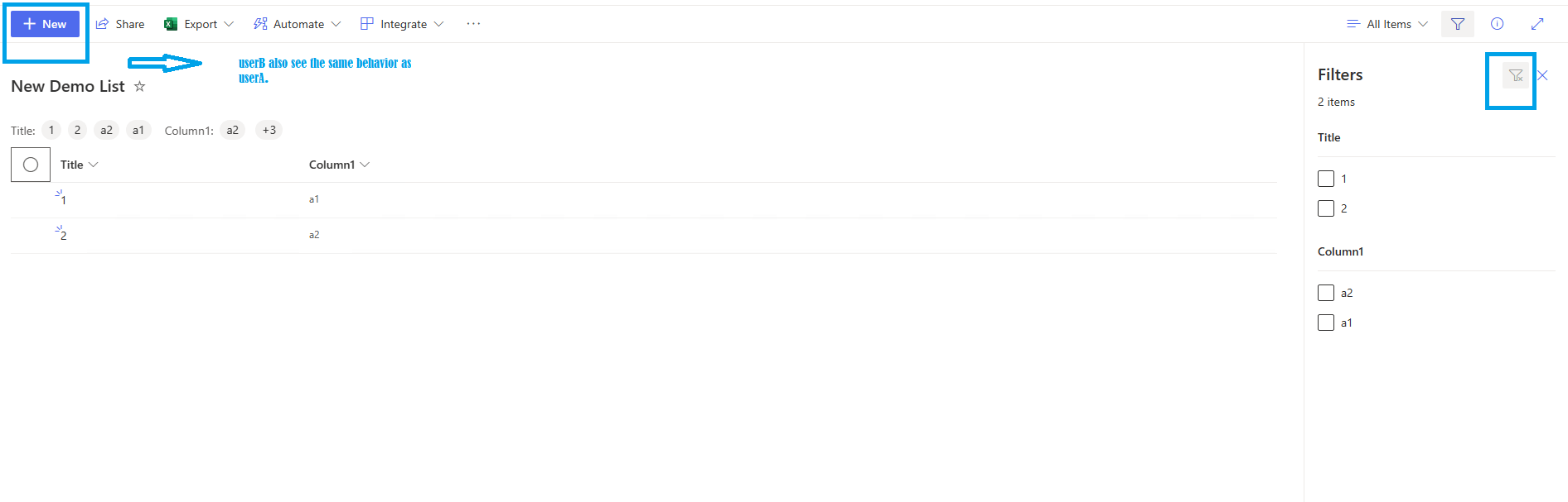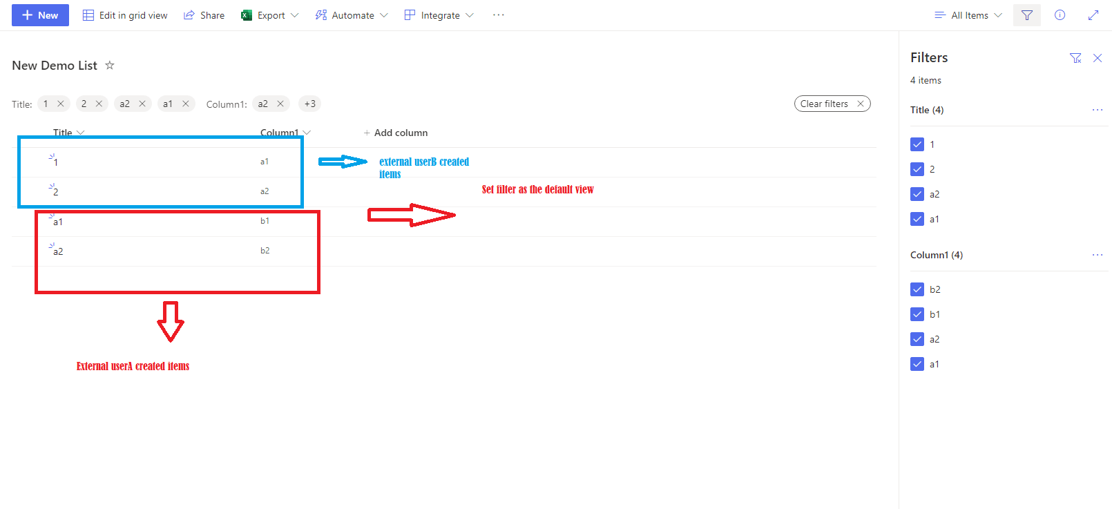 To verify the result, filter the list on the All items view and save the filter view as the default view, then use the external user accounts to access the list to see the outcome.