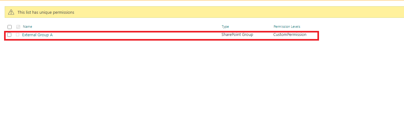 Go back to the list>Settings>List Settings>Permissions for this list>set the list as the unique permission and grant the custom permission level Custom Permission to the external group External Group A.