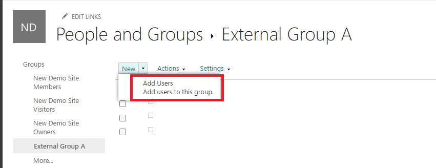 Go back to Site Settings>Site Permissions>Advanced permissions settings>Create Group>name the group such as External Group A>don't check any permission level>Create>New>Add users to this group>add all external users you want to create a new item on the list.