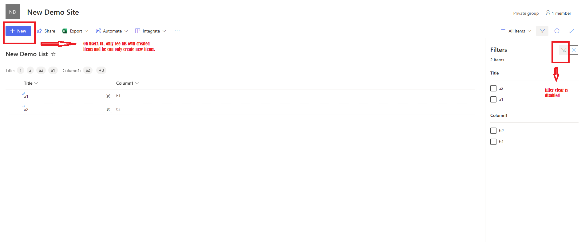 - The external users can only view their own created items and can't remove the filtered view.