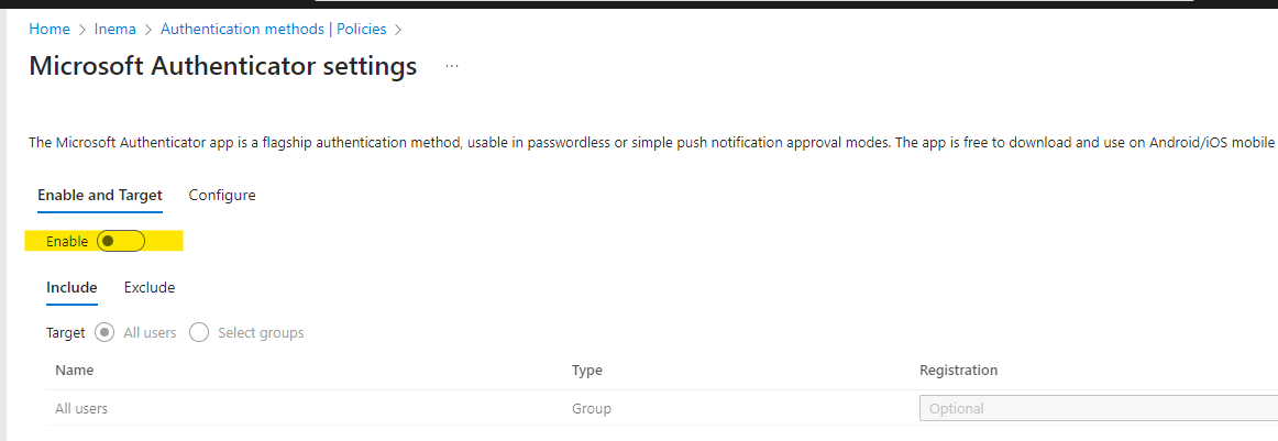 - On Authentication methods policies make sure that Microsoft Authenticator is disabled By clicking on Microsoft Authenticator and make sure that enable is turned off