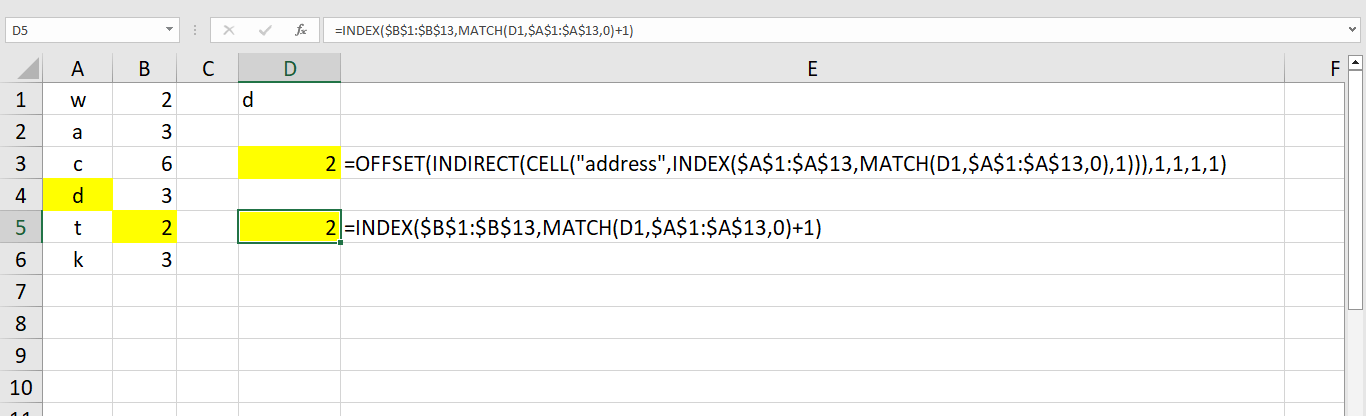 If your goal is to return the value one row below, one column next to the matching criteria (cell B5 in the picture above) then you might consider NOT using volatile functions like OFFSET(), CELL(), and INDIRECT()