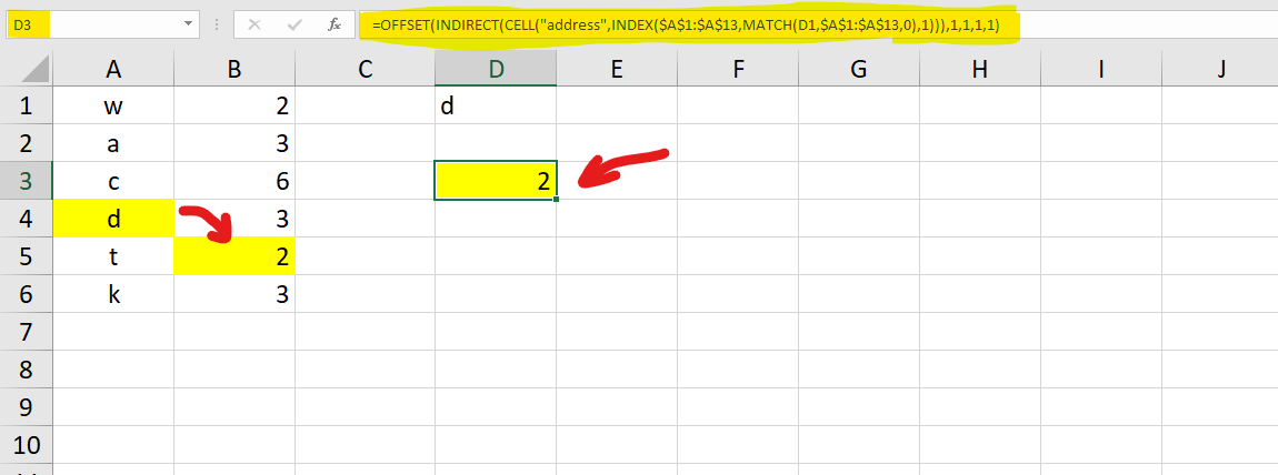 =OFFSET(INDIRECT(CELL("address",INDEX($A$1:$A$13,MATCH(D1,$A$1:$A$13,0),1))),1,1,1,1)