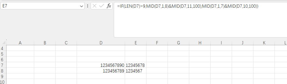 =IF(LEN(D7)>9),REPLACE(D7,9,10,""),REPLACE(D7,8,9, "")