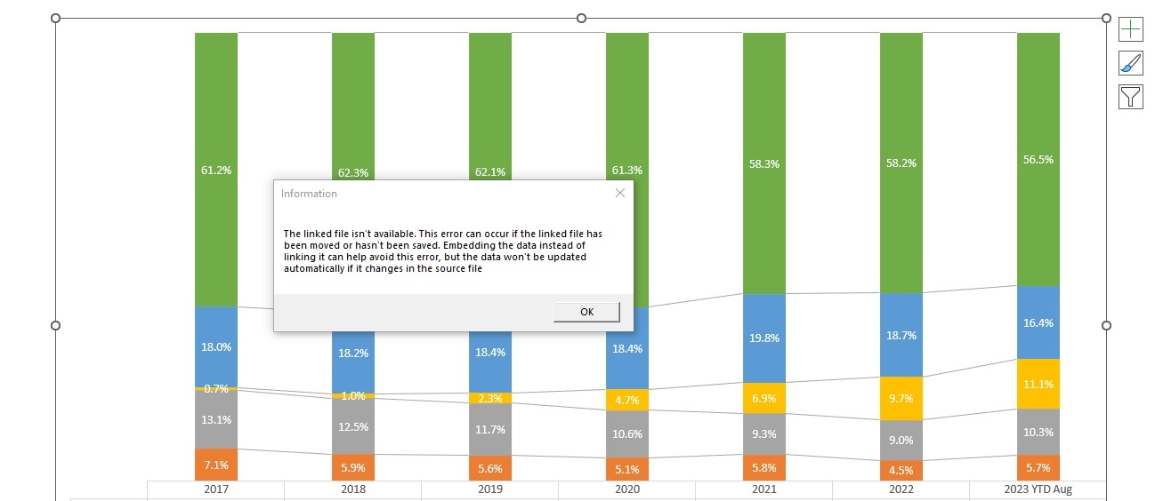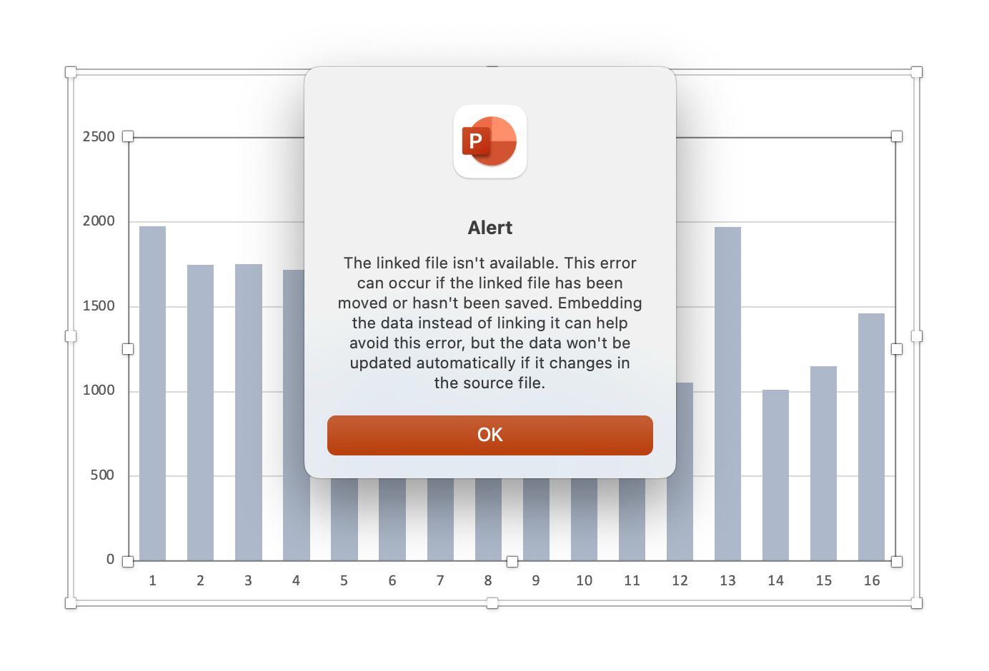 Recently whenever I try to edit an embedded Excel chart in PowerPoint, I get a message shown in the attached screenshot. I am using Office 365 for Business and the files are stored on OneDrive. I have the latest updates installed.