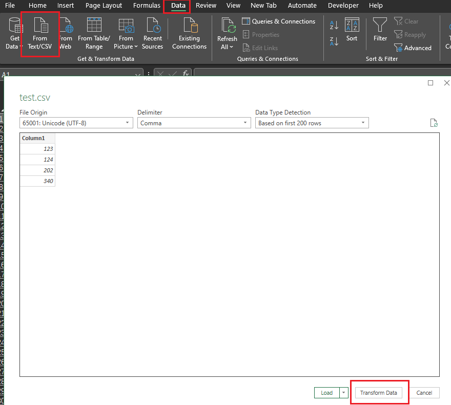 - After that, select From Text/CSVoption from Get & Transform Datagroup.