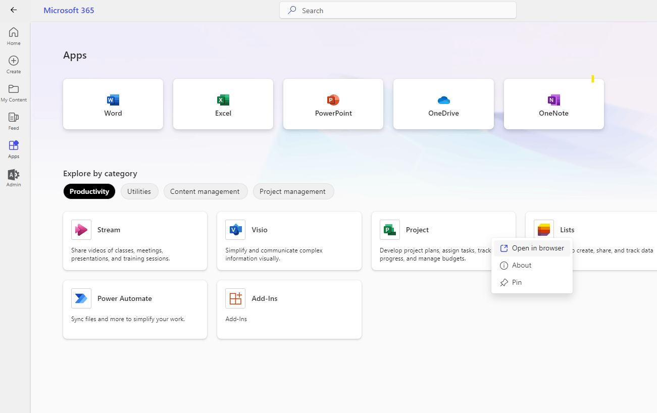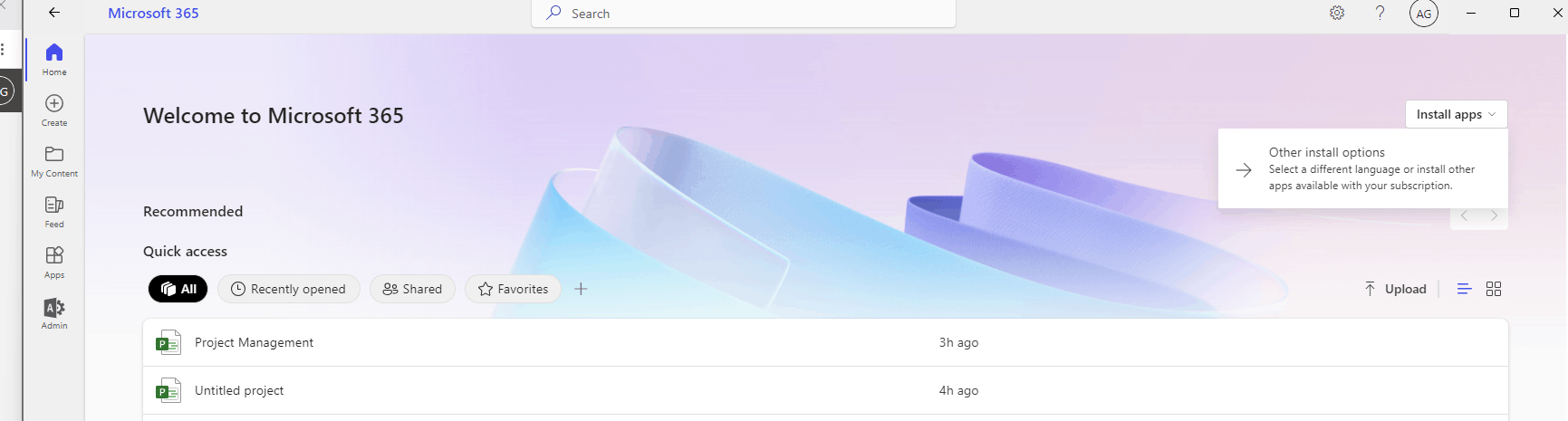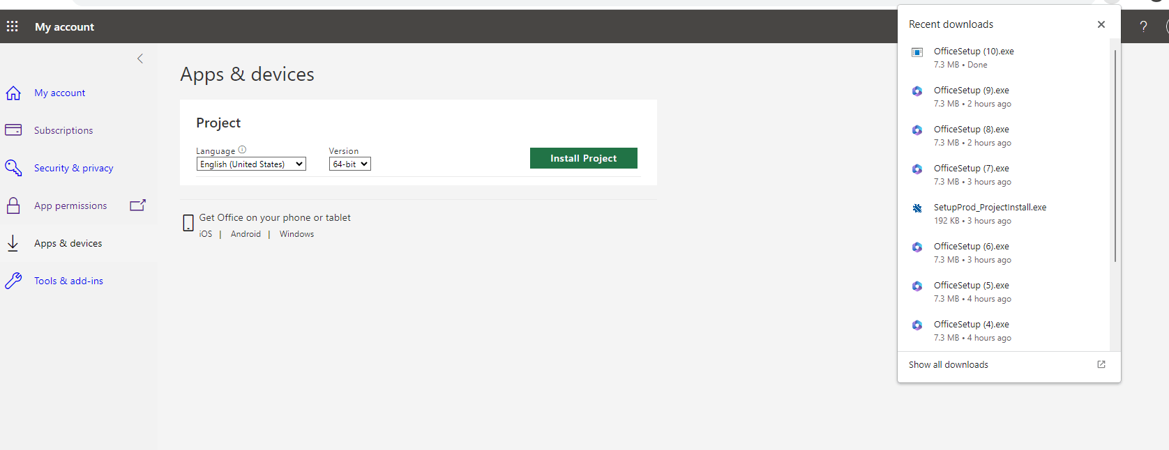 If purchased Project subscription purchased is listed, please check whether you are having “Project Online Desktop” license. If yes, please access your Office 365 account in the InPrivate or Incognito window and try to install the Project app: