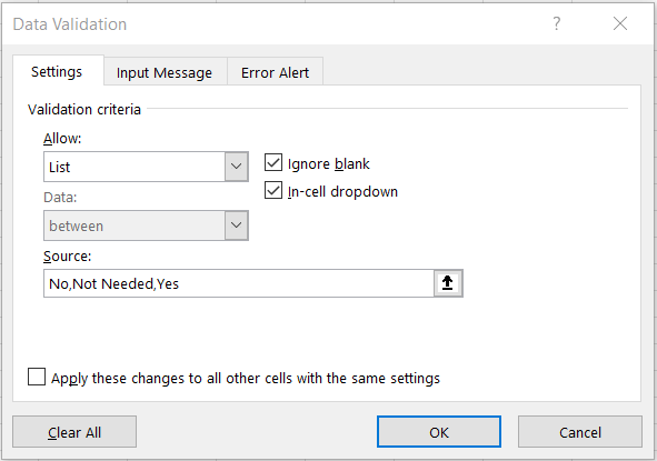 For the Data Validation, enter the three options in the Data Validation window as below.