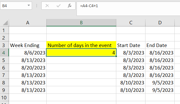 This formula checks if the start date (C5) is less than or equal to the end date of the promotion ($B$2) and if the end date (D5) is greater than or equal to the start date of the promotion ($B$3). If both conditions are true, it calculates the minimum of the end date and the week ending date ($A5) minus the maximum of the start date and the start date of the promotion ($A5), and adds 1 to include both the start and end dates. If either condition is false, it returns 0.