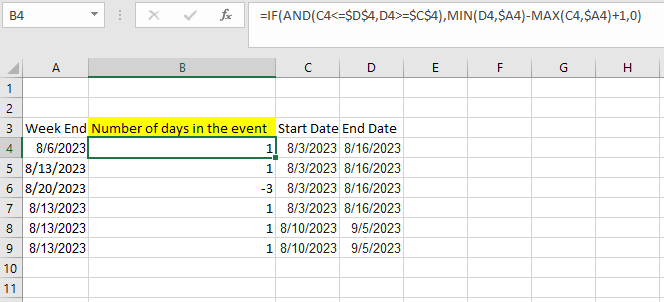 =IF(AND(C5<=$B$2,D5>=$B$3),MIN(D5,$A5)-MAX(C5,$A5)+1,0)