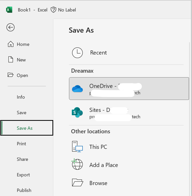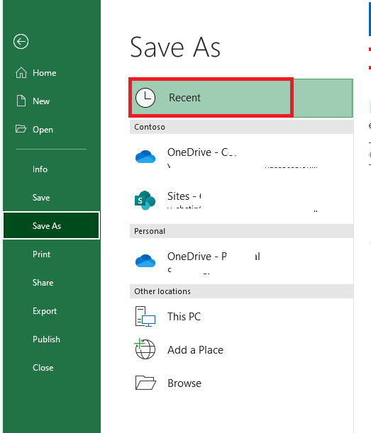 I went through your post carefully. May I know if the situation is that when you go to File>Save As, the Recent option is not selected, but OneDrive option is selected? (in the screenshot below, Recent option is selected)