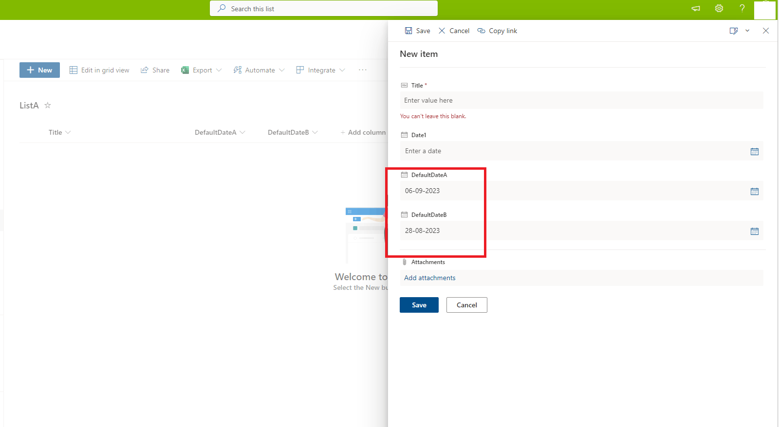 My scenario is that List 1 is being used as an internal work order ticketing system. We have a required lead time due to constraints with material procurement so we need the date-type column named Onsite Date to always default to 2 weeks from the current date. Similarly, I have a List 2 which needs a minimum of 3 business days lead time for its Start Date.